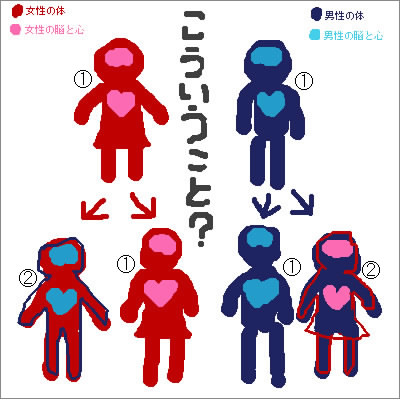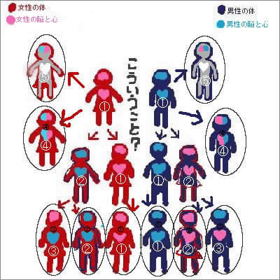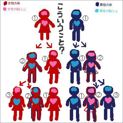 女性の体になりたい、男性の体を持った男性。(男の肉体に女の精神です。)→青の②